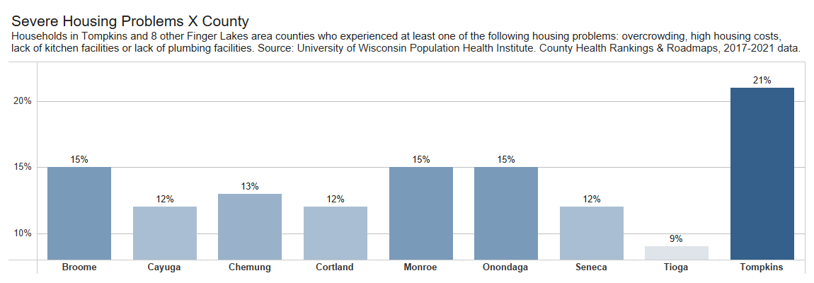Safe, stable, and affordable housing is essential for health, safety, and overall well being. Housing instability can increase the risk of poor physical and mental health, disrupt access to care and employment, and deepen existing inequities. In Tompkins County, rising costs, limited availability, and structural barriers continue to make it difficult for many residents to secure and maintain stable housing.