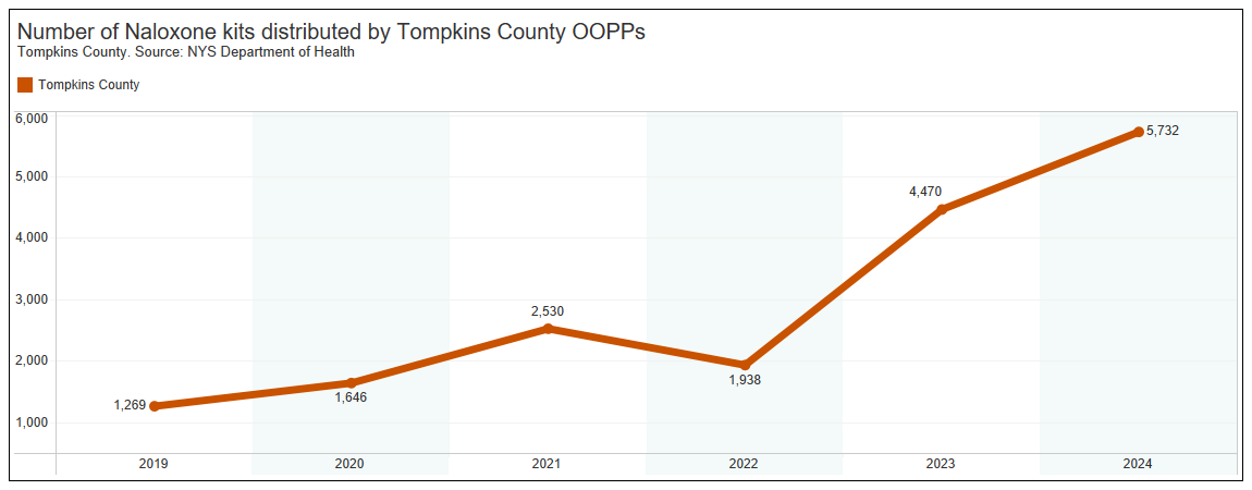 Naloxone kit distribution: number distributed by Tompkins County Opioid Overdose Prevention Programs (OOPPs)
