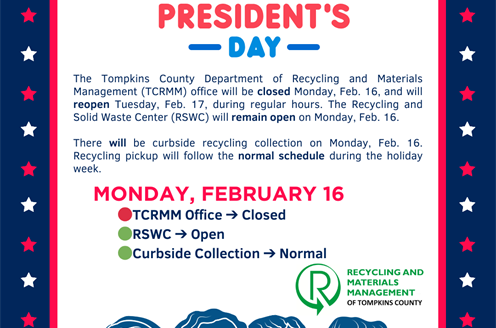 The Tompkins County Department of Recycling and Materials Management (TCRMM) office will be closed Monday, Feb. 16, and will reopen Tuesday, Feb. 17, during regular hours. The Recycling and Solid Waste Center (RSWC) will remain open on Monday, Feb. 16.